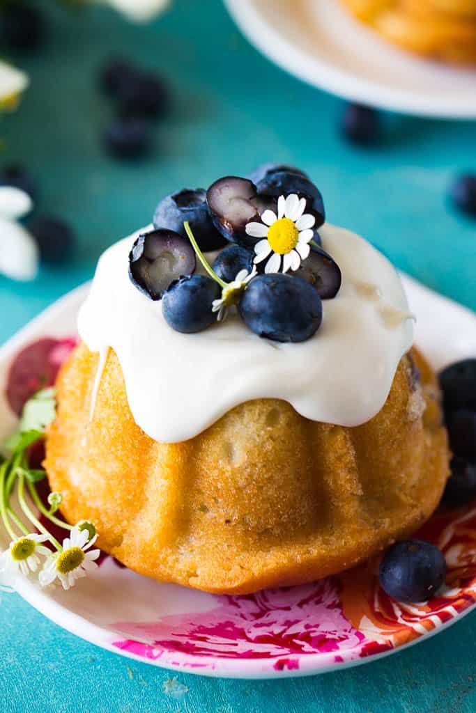 kue blueberry dengan irisan buah blueberry dan lelehan fla rasa vanila.