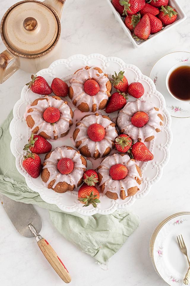 kue strawberry dengan irisan buah strawberry dan lelehan fla berwarna pink.